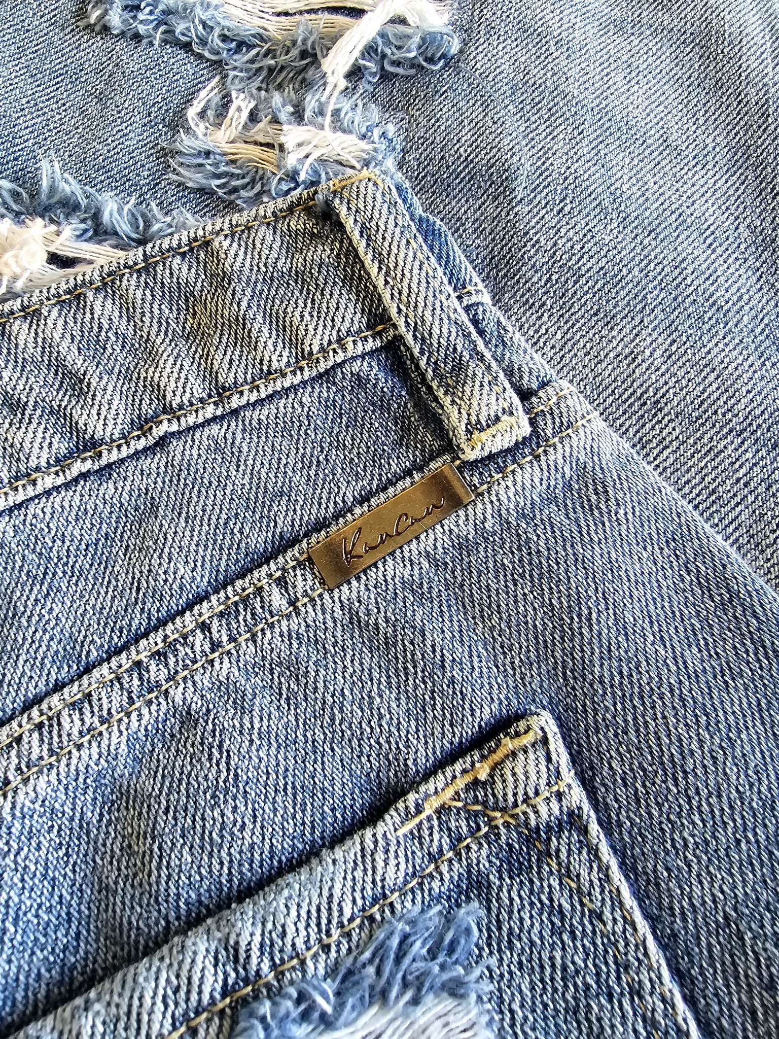 Super comfortable KanKan distressed denim shorts in a light wash denim