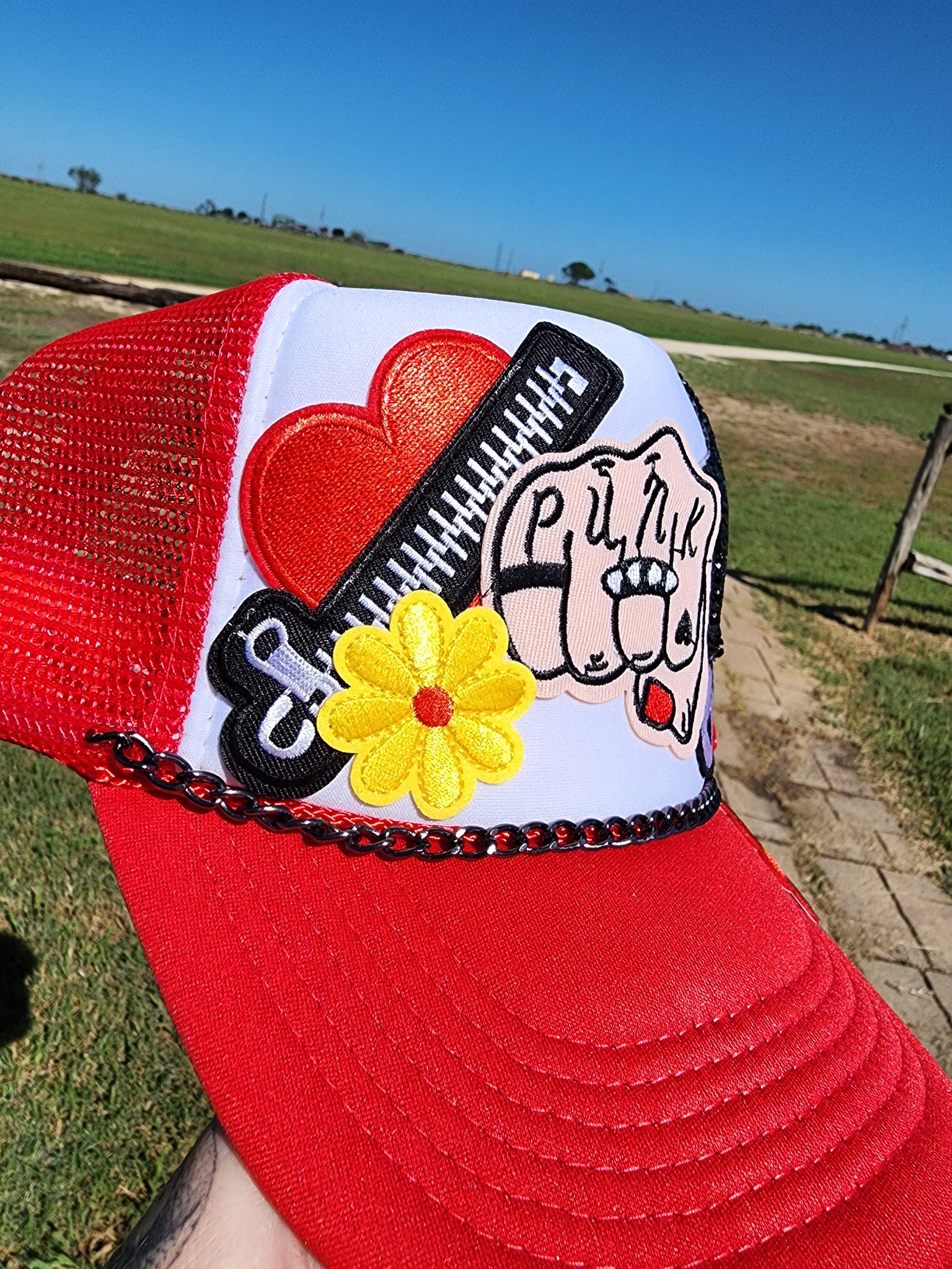 Red and white trucker style cap