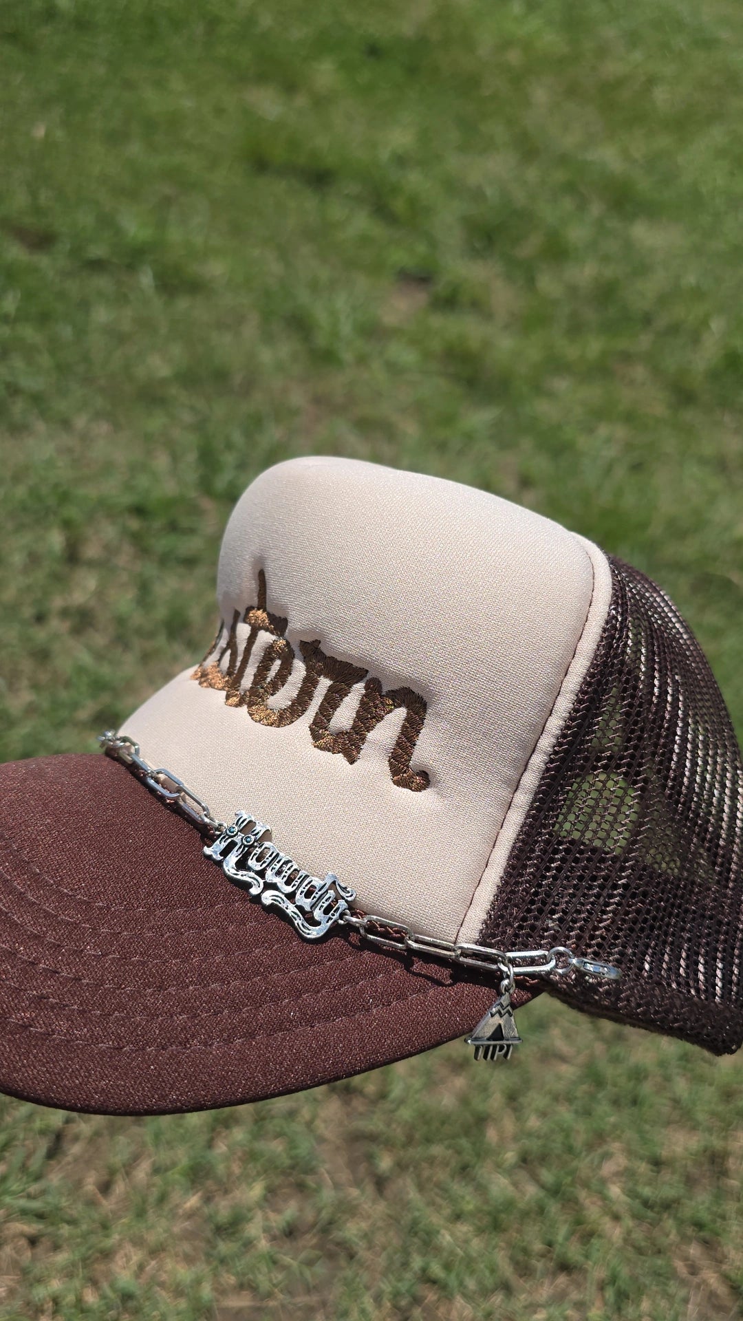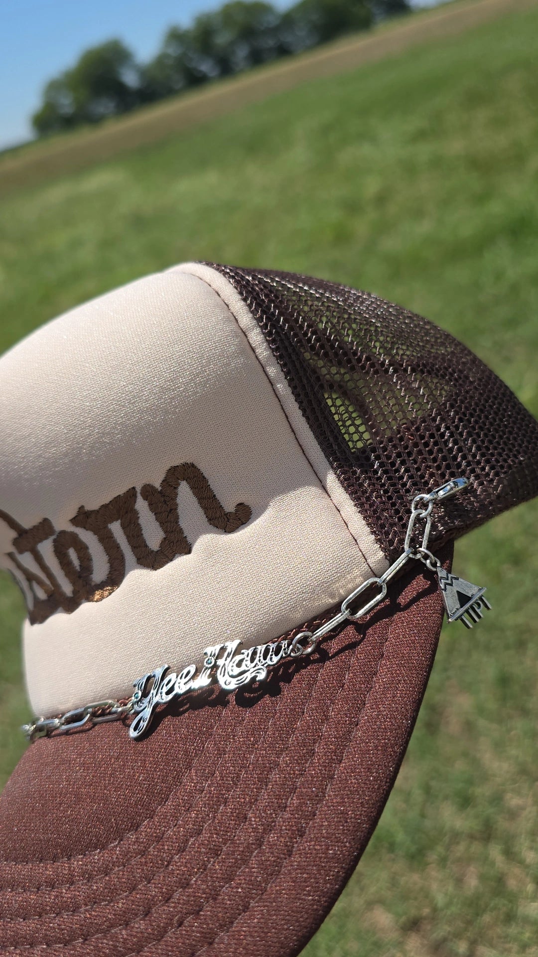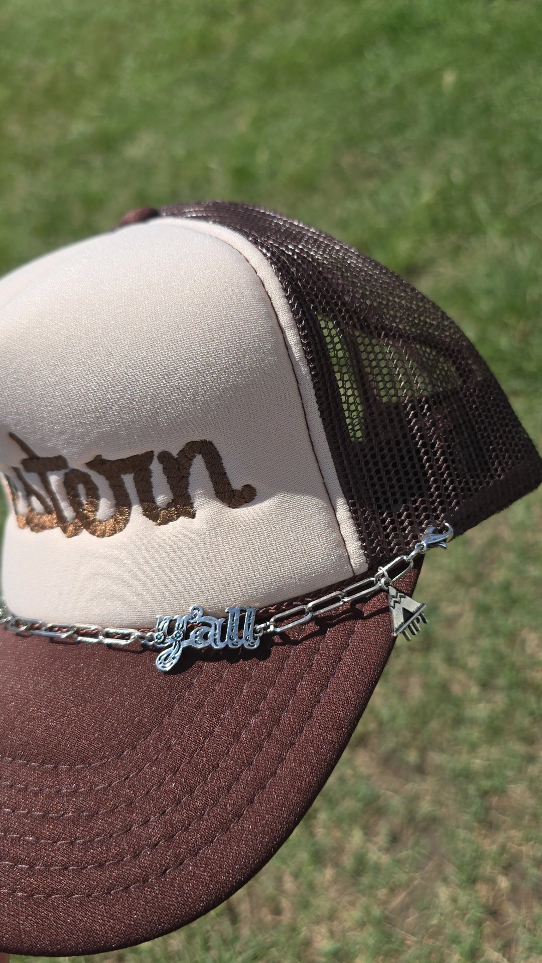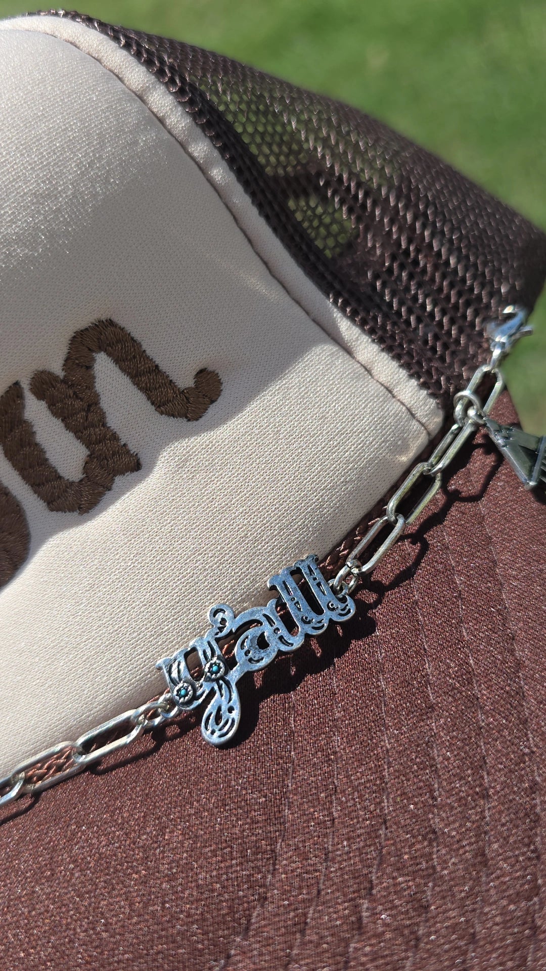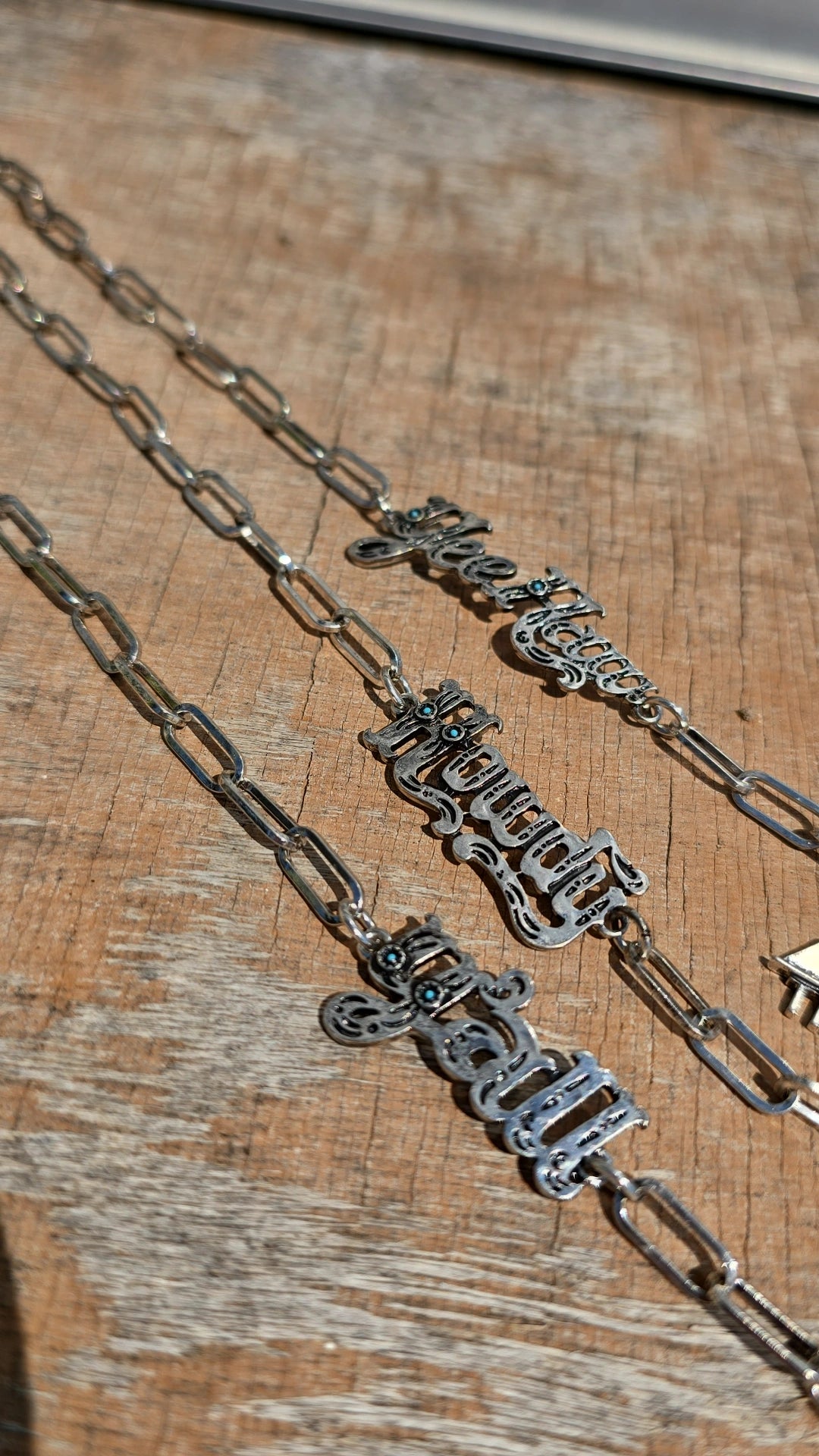 Linked chain w/ word charm, logo charm and two lobster clasps