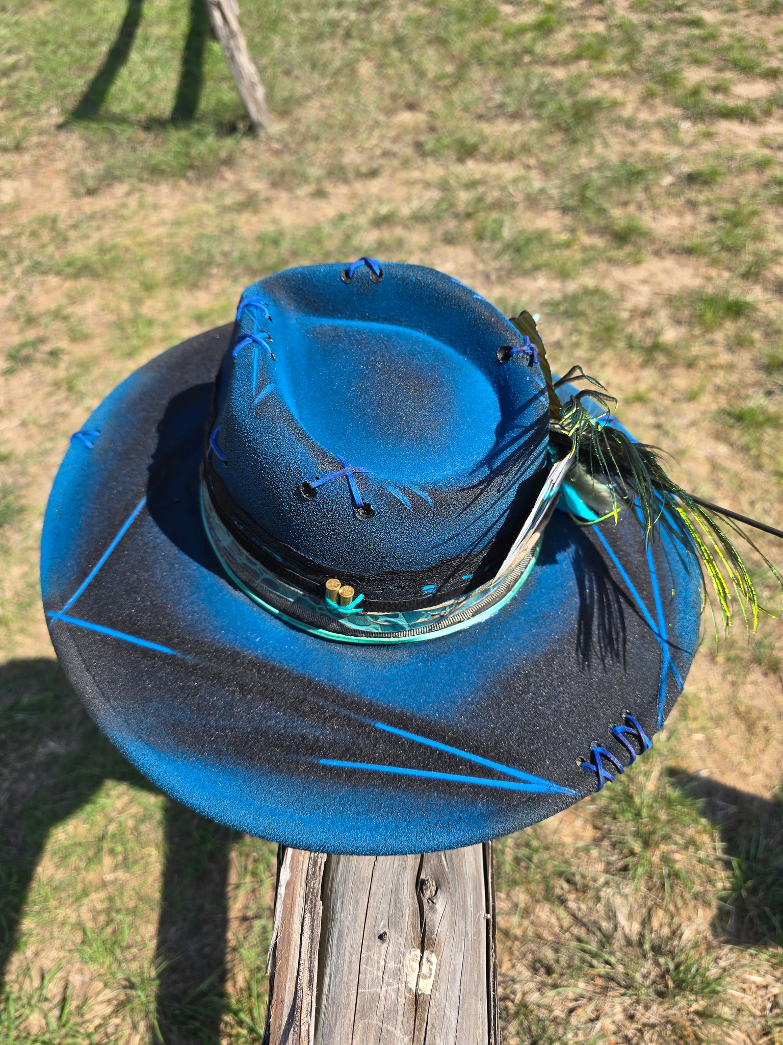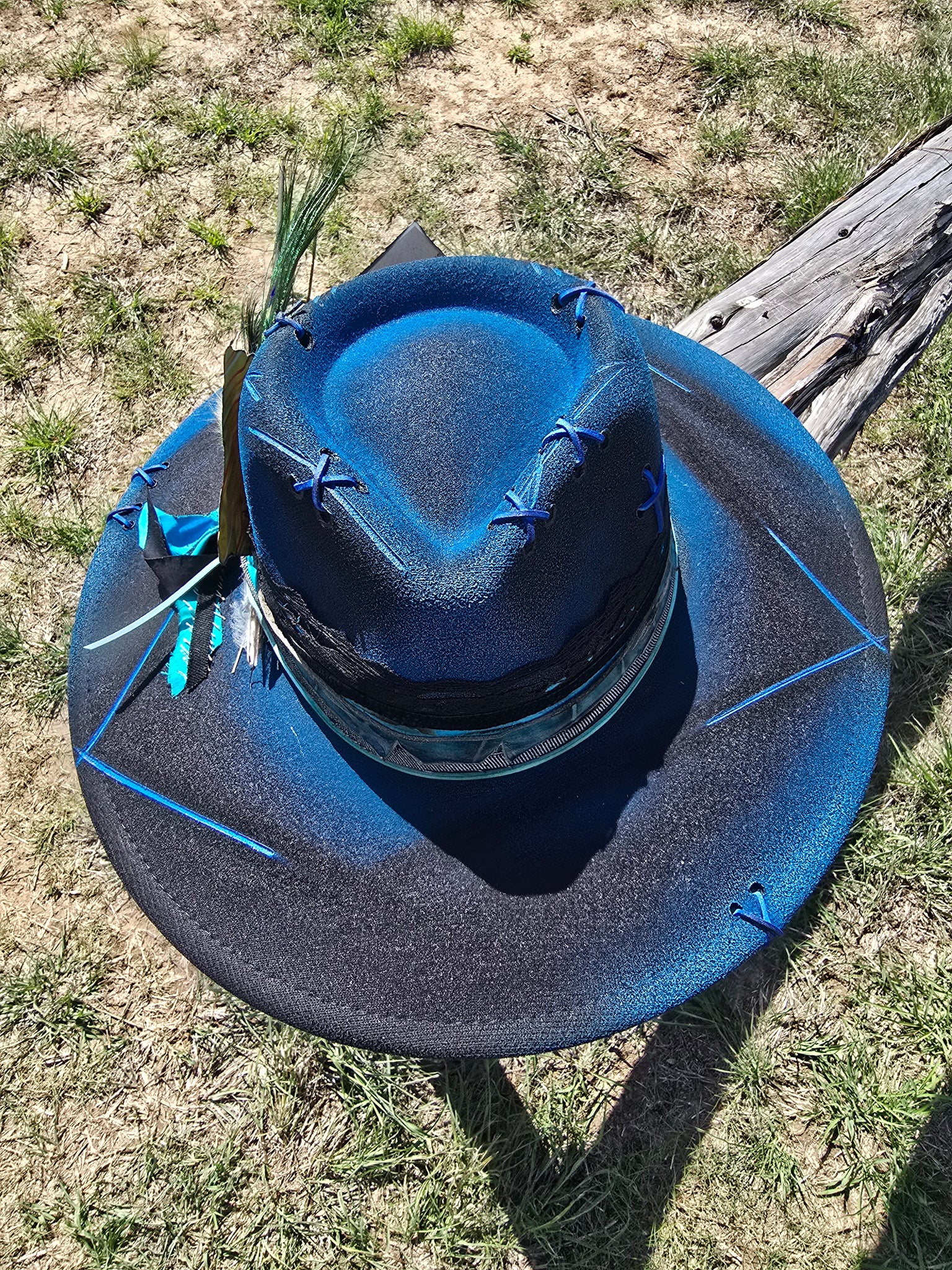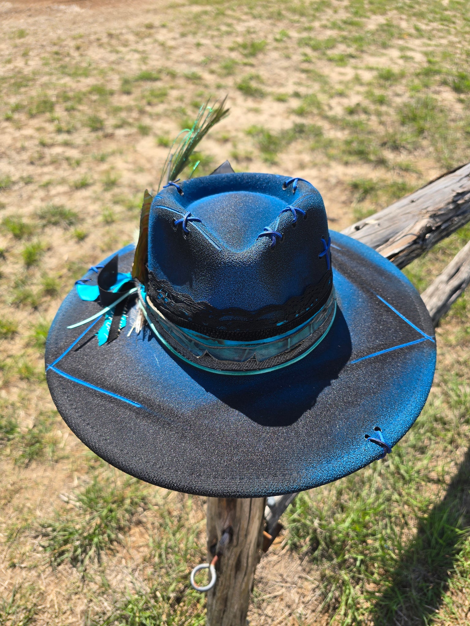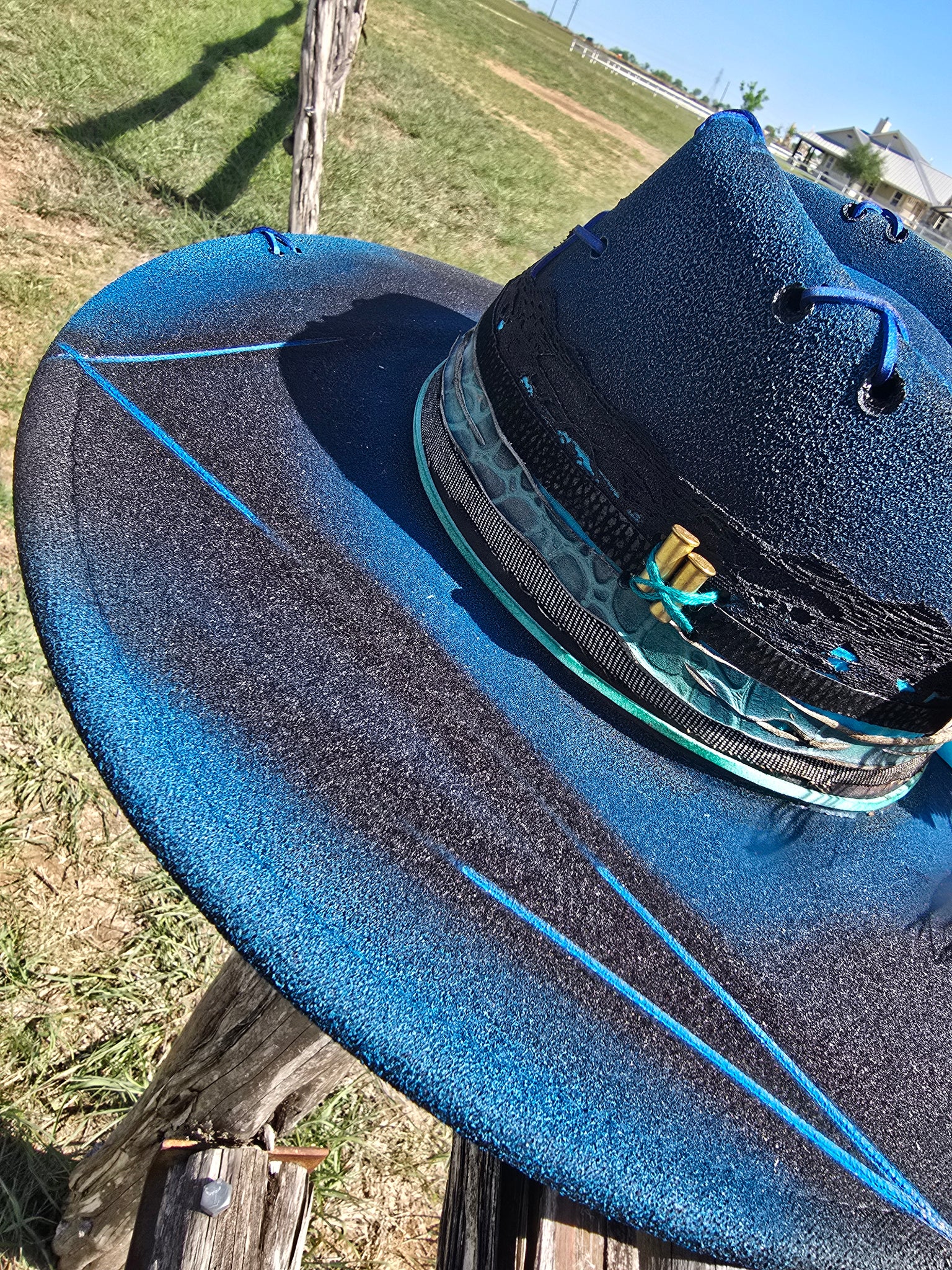 Solid black poly-blend panama hat sprayed with bright blue paint