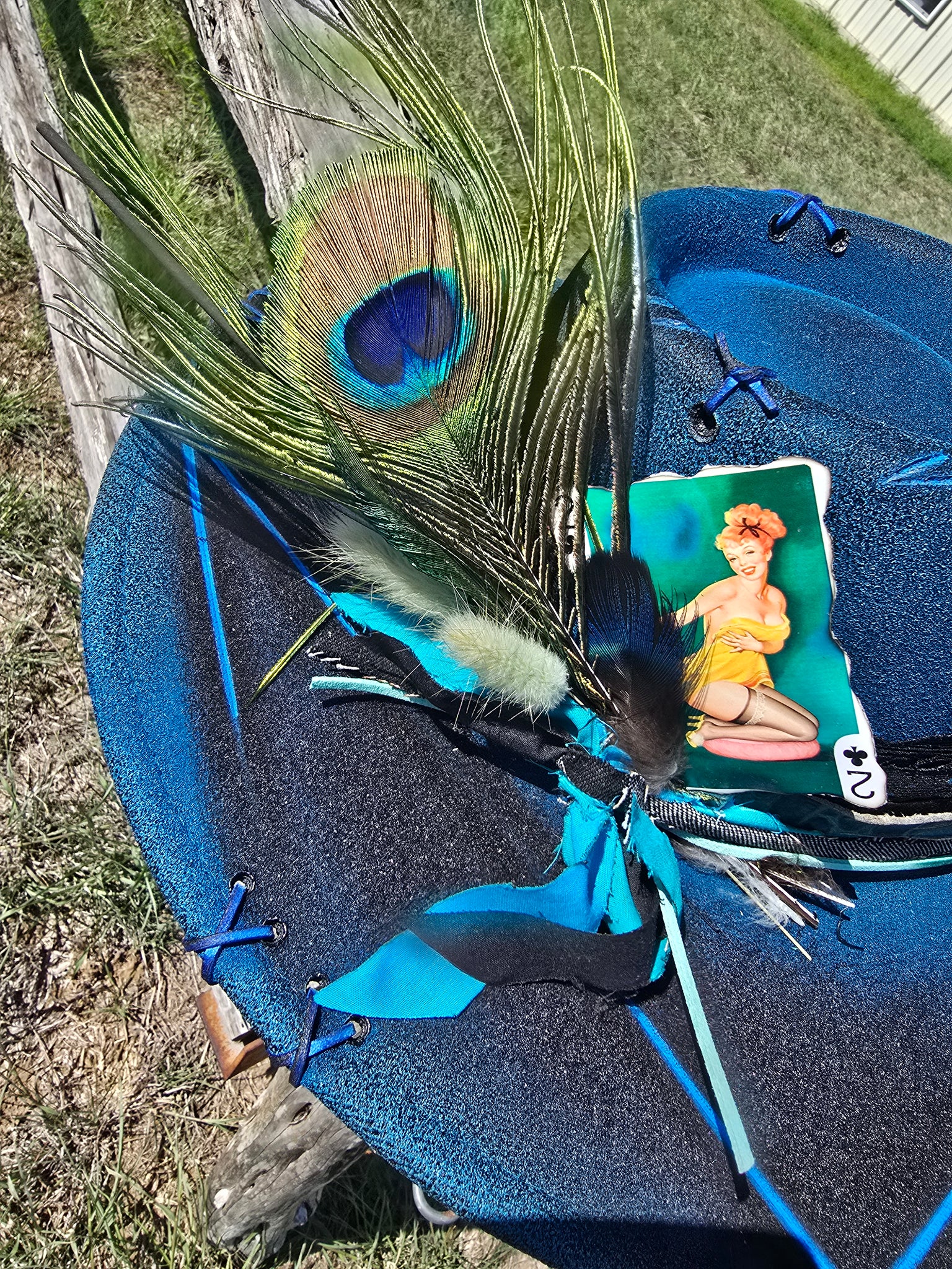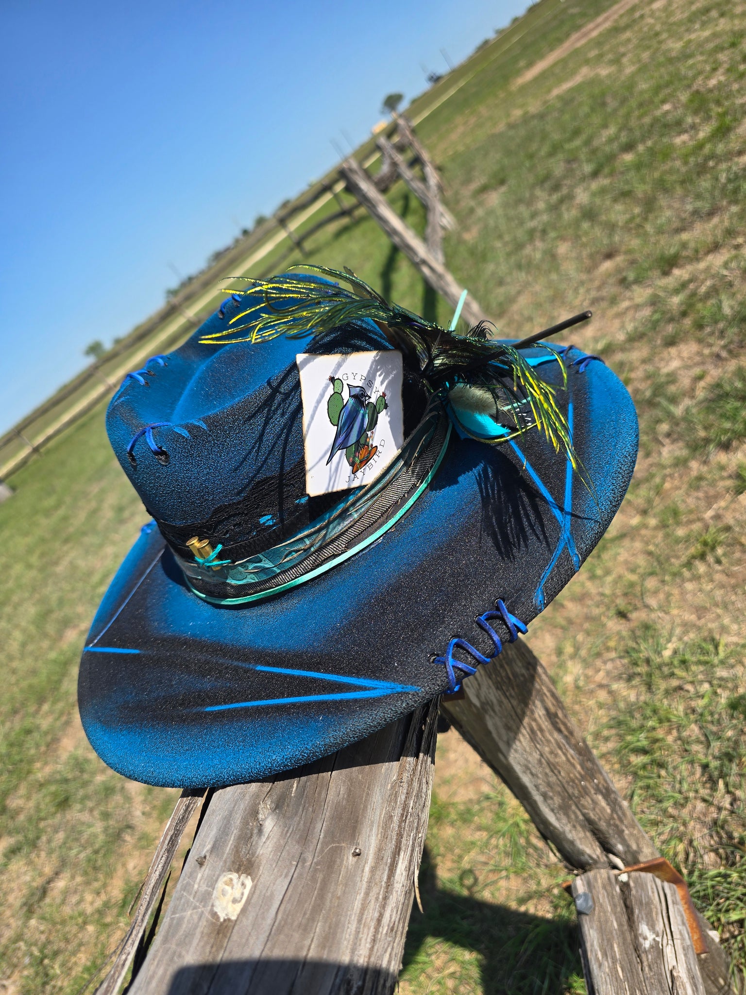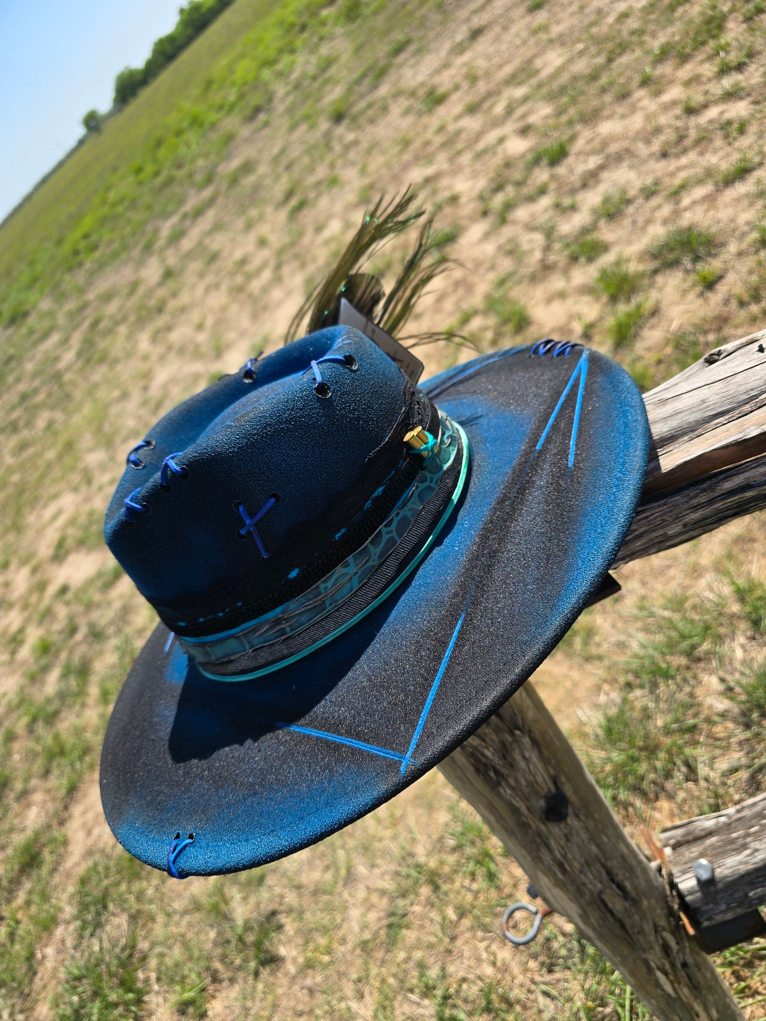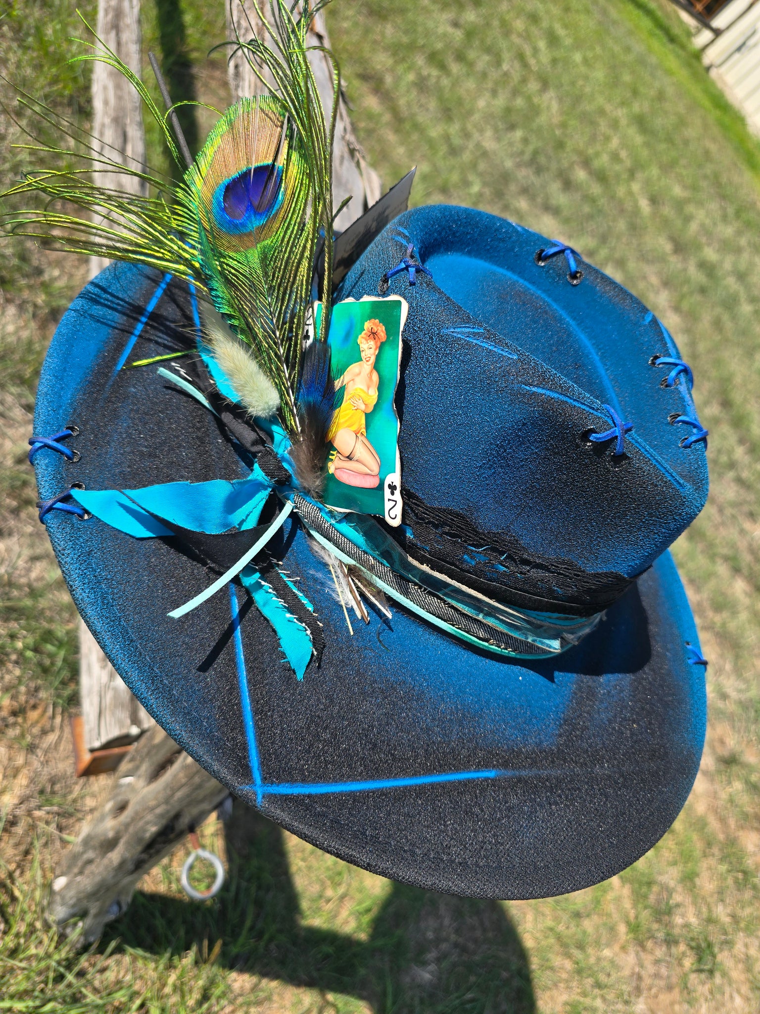 Solid black poly-blend panama hat sprayed with bright blue paint