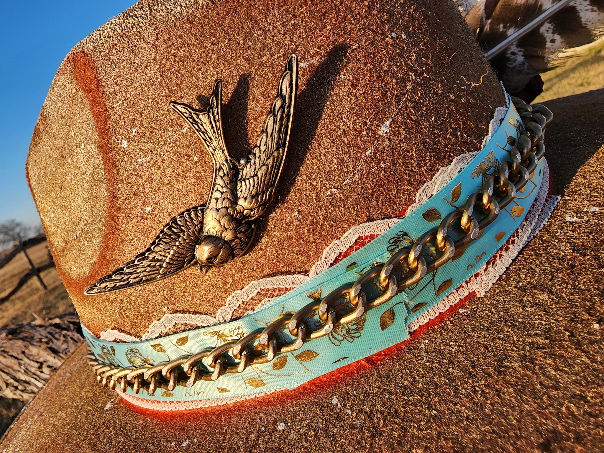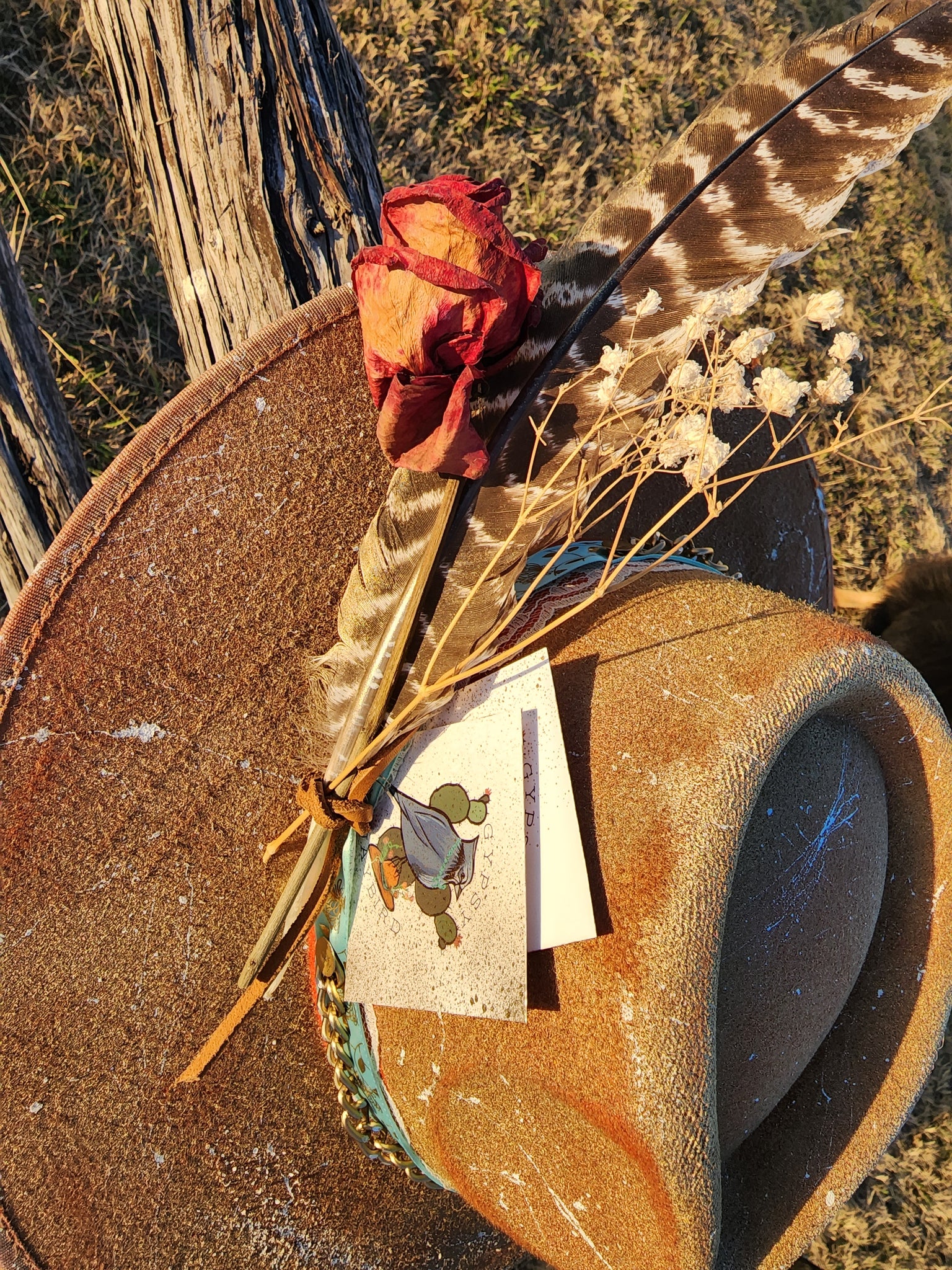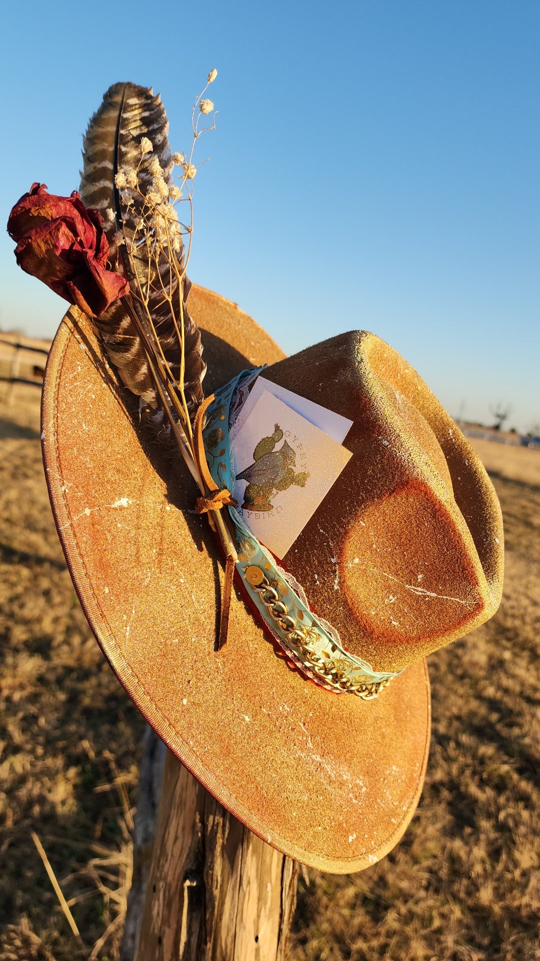 Originally a bright orange wide brim hat that's been distressed, sprayed & splattered with metallic gold & matte white