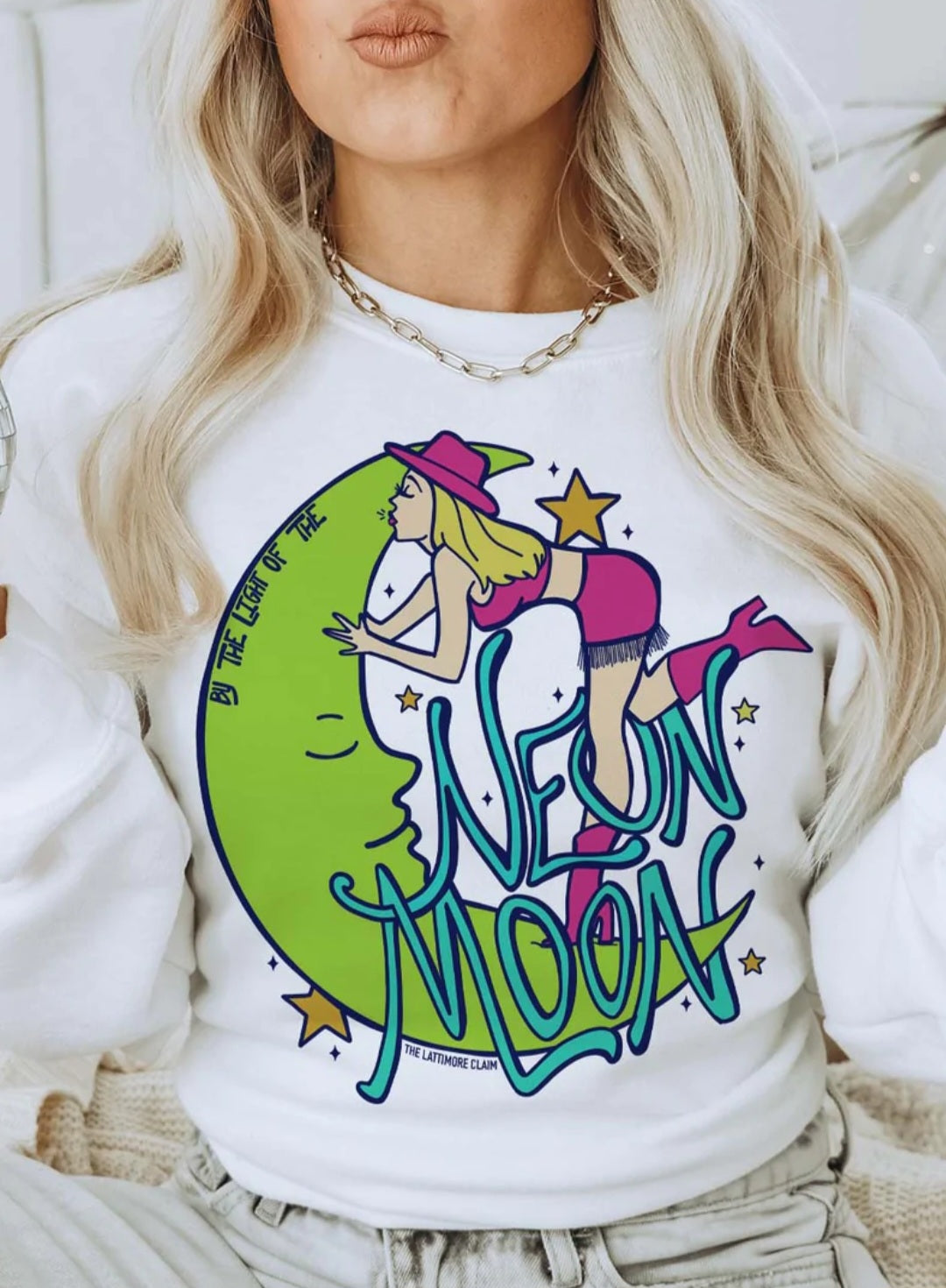 Scoopneck white tee or sweatshirt with neon graphic